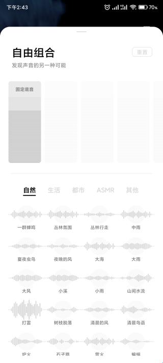 自然、生活、都市、ASMR等多种类型数百种音效供用户自由选择,组合出你最喜欢的背景音,在自己专属的声音空间中放松自我
