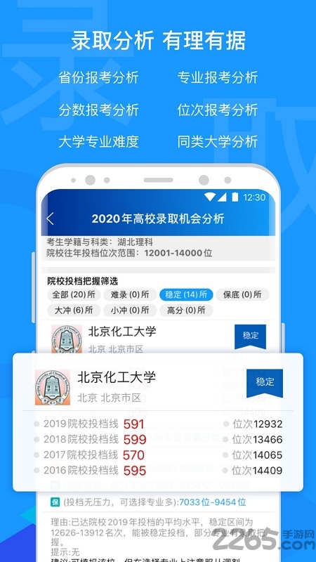 按省份选大学分析,按专业选大学分析,按分数选大学分析,按位次选大学分析,分析大学专业录取把握,同类院校录取分析,六大分析功能帮您选出理想的大学专业填报组合方案;