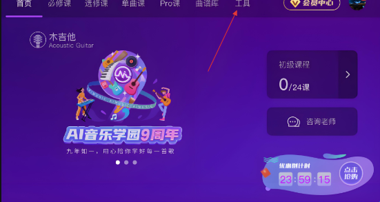 1、打开AI音乐学园APP,点击页面上方的工具选项。