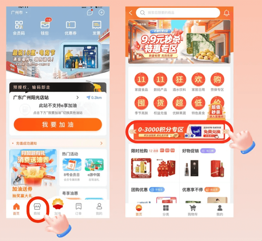 打开中油好客e站App,点击底部“商城”进入积分专区兑换。