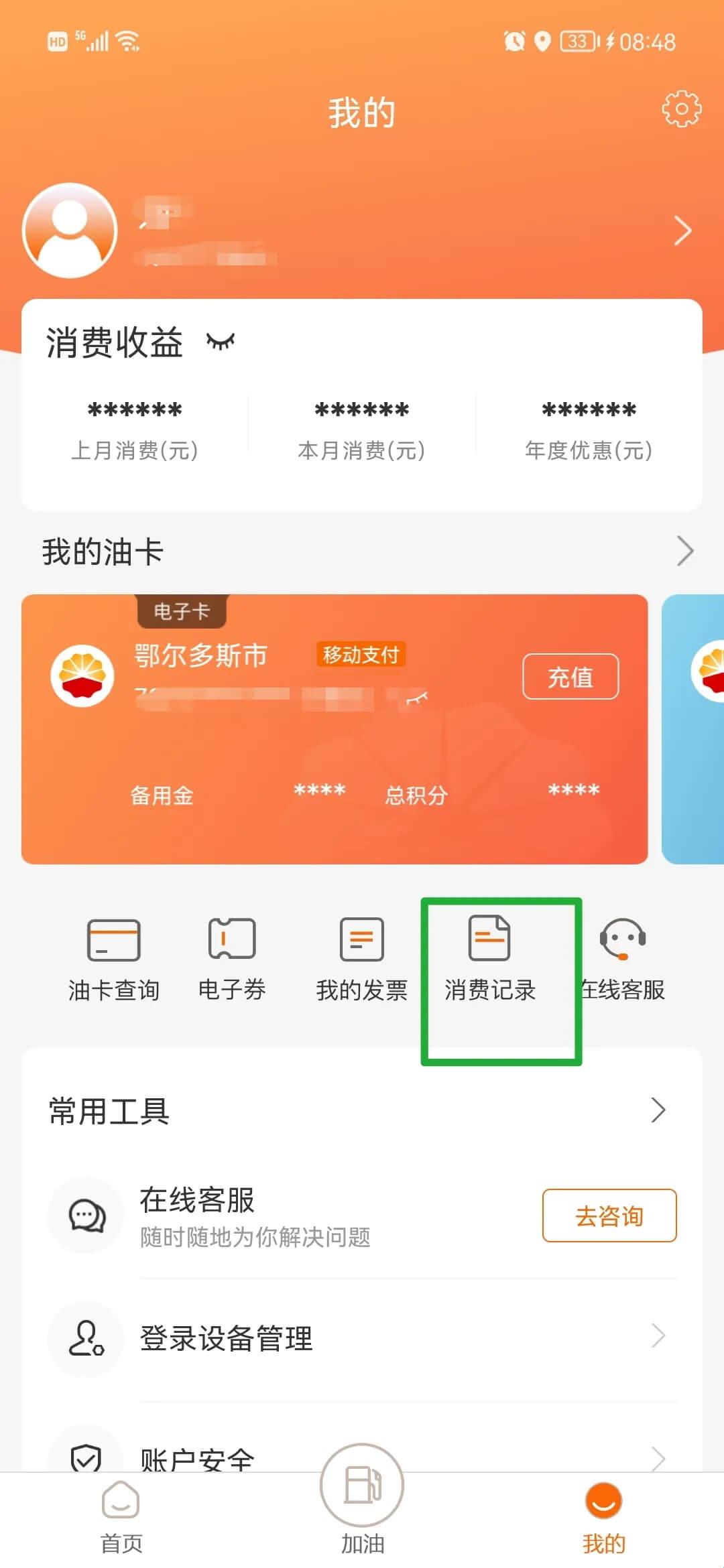 第二步:点击我的油卡下面“消费记录”;
