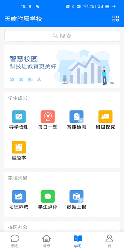2、学习:导学检测、每日一题、智能检测,助力学生成长,习惯养成、学生点评、数据上报,家长即刻知悉。