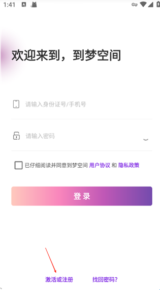 1、打开到梦空间App点击激活或注册。