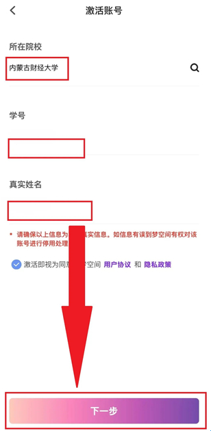 3、根据提示填写所在院校、学号、真实姓名,并完善个人信息点击下一步。