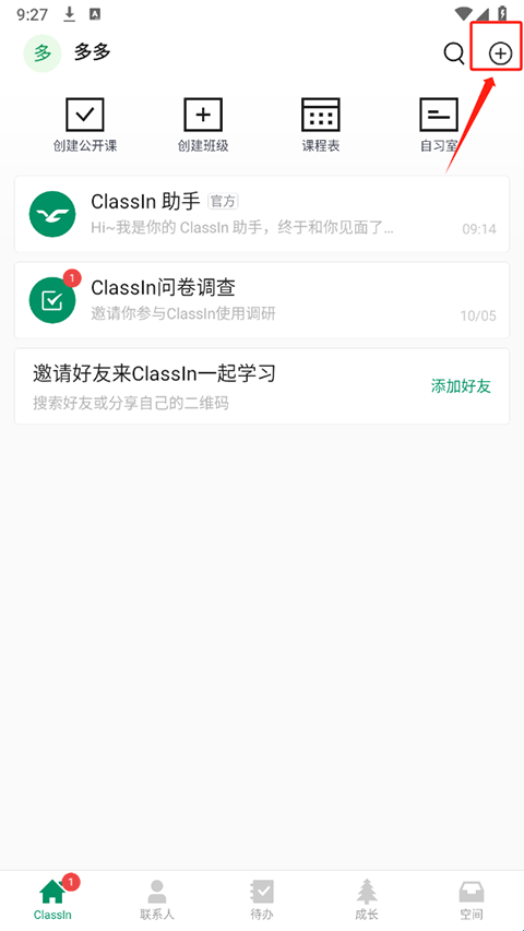 1、在ClassIn界面中点击右上角+号按钮。