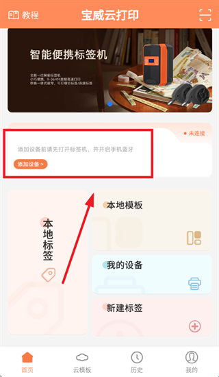 2、在宝威云打印APP首页,点击 【添加设备】。