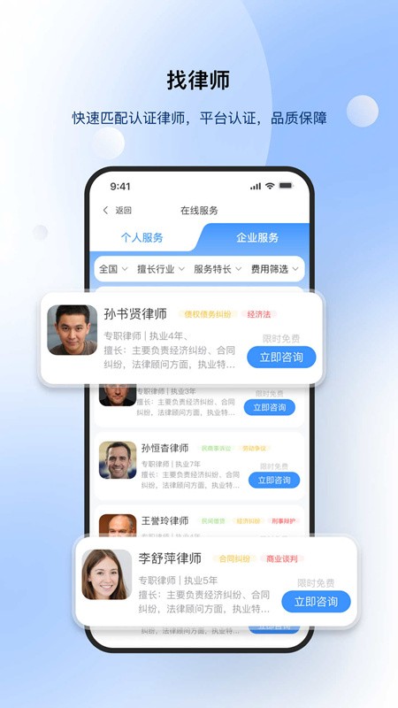 4、找律师:全国海量律师,多维度展示律师信息如执业律所、擅长领域、执业年限、从业经验、过往案例等,为您匹配满意的律师。