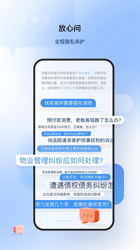1、安心咨询:对用户咨询的所有法律问题提供加密保护,用户可以放心的在线开展法律问题咨询。