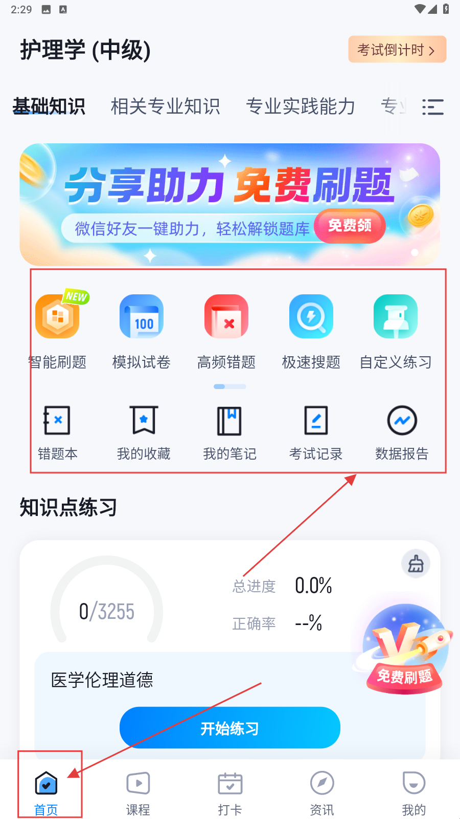 1、打开应用,在【首页】点击功能区(如智能刷题、模拟试卷),进入学习练习操作。