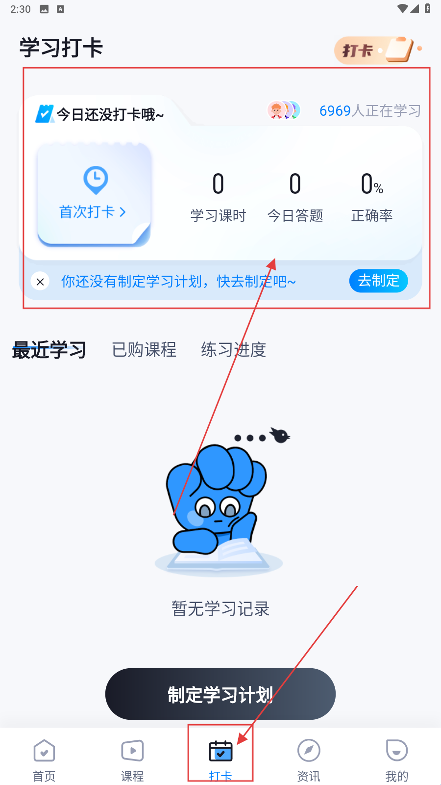 2、切换到【打卡】页面,点击查看学习打卡数据区(含学习课时、答题统计),开启打卡管理。