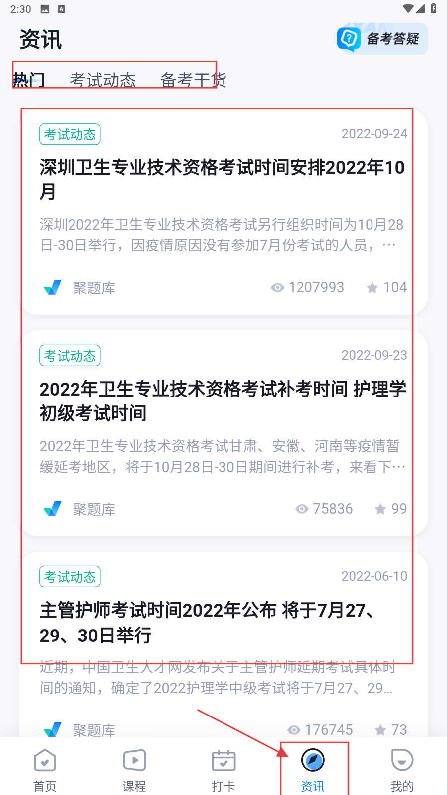 3、进入【资讯】板块,选定分类(热门、考试动态),浏览对应内容(考试安排、干货),完成信息获取任务。