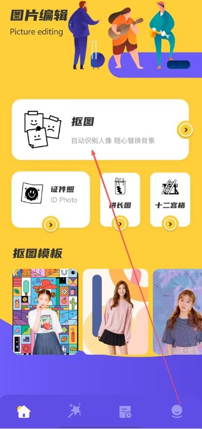 1、用户进入软件之后可以直接在图片编辑页面中体验抠图、证件照、拼长图和模板进行使用。