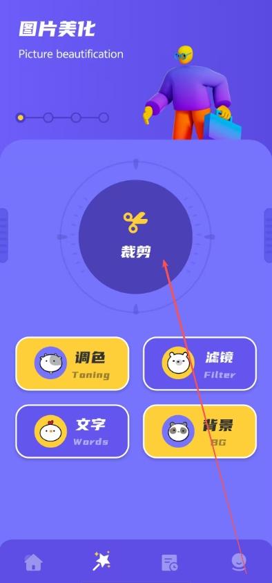 2、在图片美化页面中用户还可以对图片进行裁剪、调色、滤镜、文字和背景进行选择。