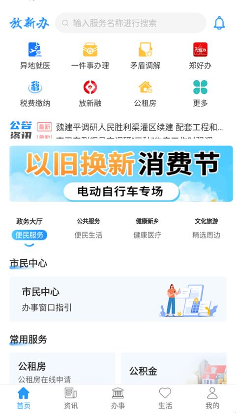 放新办,新乡市政府官方城市门户APP,通过大数据、云计算、人工智能等前沿技术,将多种应用加载到一个APP上,打造全市统一的移动便民服务平台,为新乡本地居民提供政务服务、综合治理服务、公共服务、医疗服务和金融服务等五大服务,足不出户就能全方位的享受移动便民生活服务。