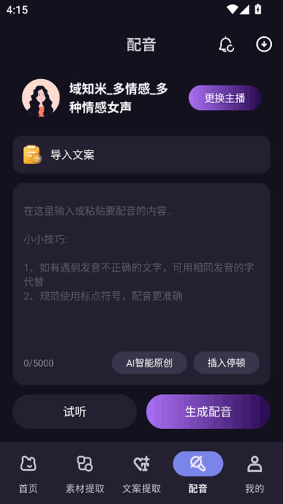 4、配音:提供丰富配音模板,多种音色可选,输入文字即可生成配音,用于视频旁白、解说等场景。