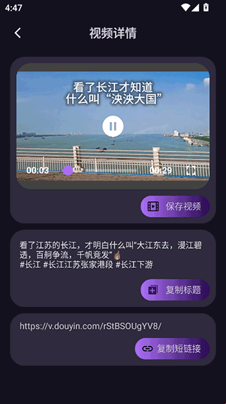 1、首先这软件所有功能完全免费,软件中没有登录和付费渠道,使用也很简单,例如你复制抖音上的视频链接后再打开这个软件就会识别链接中的方案和视频。
