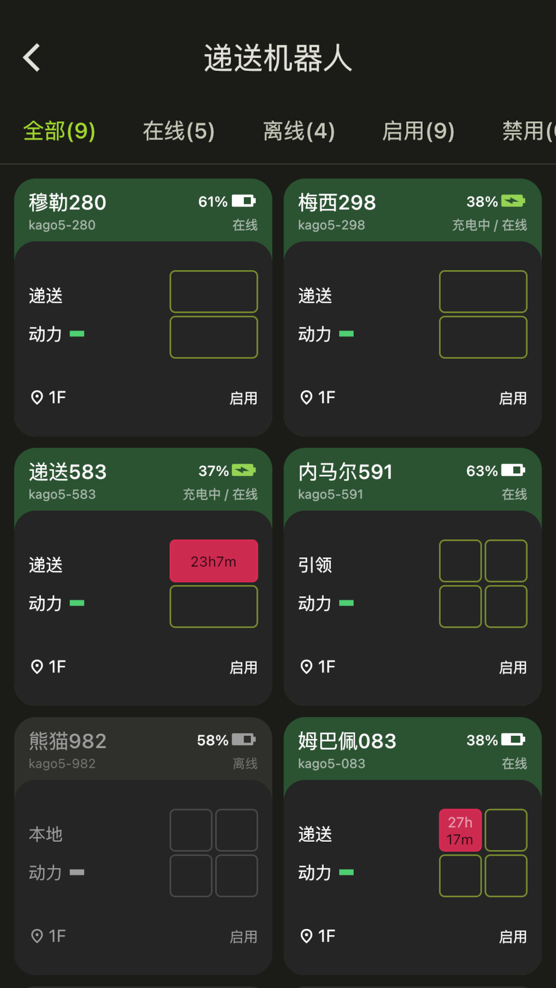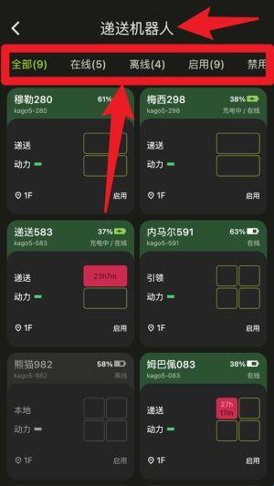 5、在递送机器人页面,用户可按在线、离线、启用等分类查看机器人状态,监控其电量与执行任务情况,确保管理与调度高效运行。