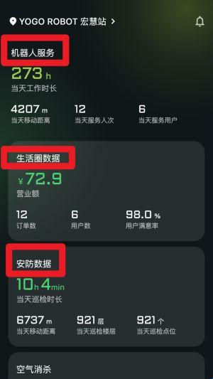2、页面中,用户可查看机器人服务数据、生活圈经营数据以及安防巡检数据,全面掌握楼宇运行的实时动态与服务情况。