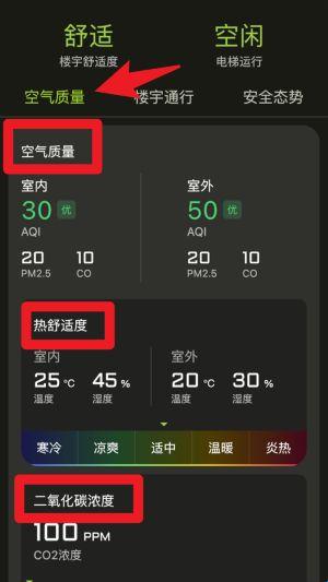 4、在舒适度监控界面,用户可以查看空气质量、热舒适度和二氧化碳浓度等指标,实时掌握室内外环境数据,便于调节楼宇环境。