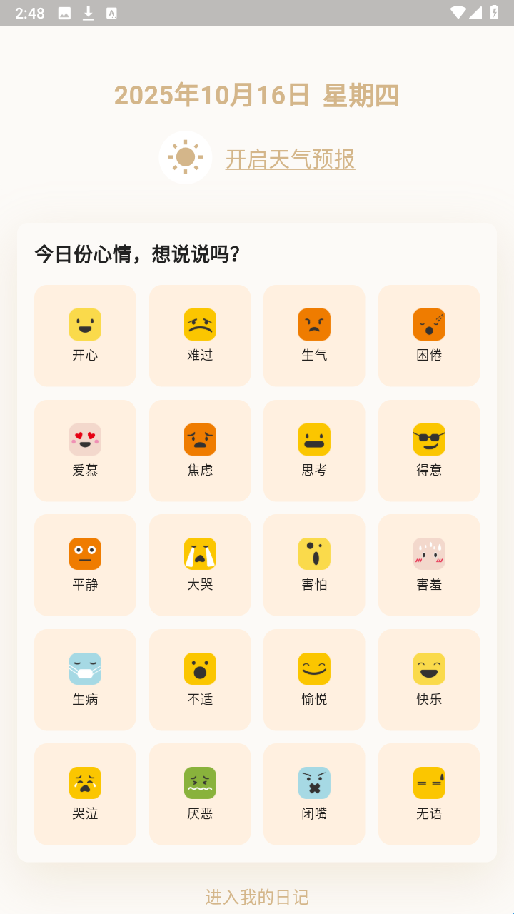 2、心情日记:个性化心情记录模式,可通过选择表情记录自己的心情,保存每天情绪。
