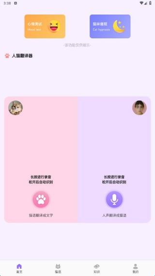 1、首页带来了人猫翻译器功能,可以轻松识别语言,便于我们沟通,还有心情测试和猫咪催眠服务。