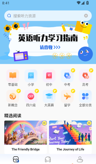 3、兴趣学习:有声读物、名人演讲、公开课、少儿英语、影视英语等丰富资源。