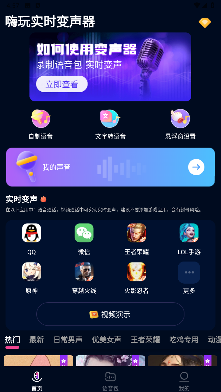 嗨玩实时变声器采用全新变声算法,效果更丰富自然,包含小男孩,小女孩,男青年,女青年等系统预设变声效果,支持自定义设置变声参数,DIY个性化声音,海量的火爆语音包,非常适合各大游戏和聊天软件中使用。