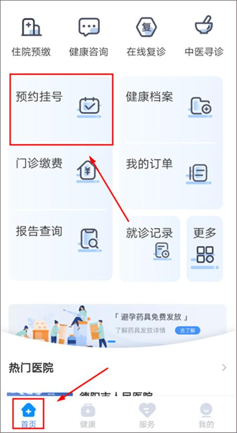 1、打开登录健康德阳app,点击首页内的【预约挂号】。