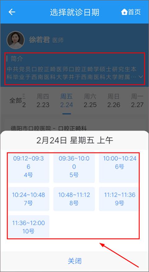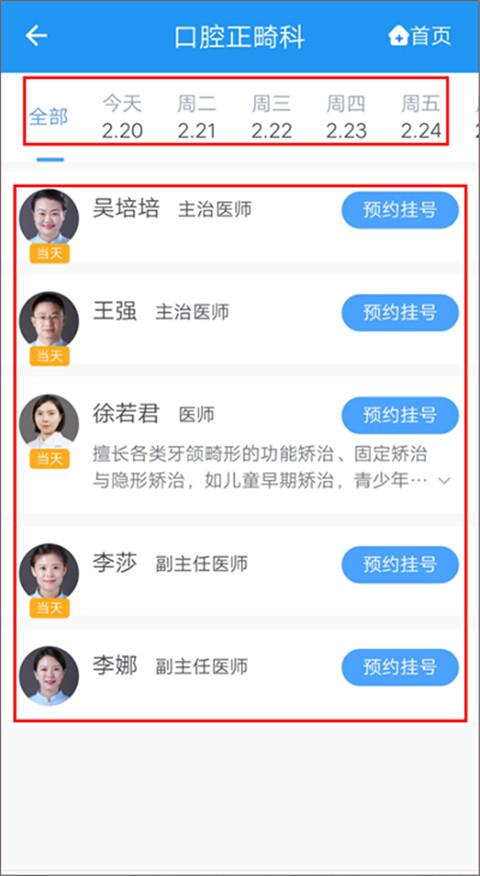 4、选择完成科室后,在该科内选择挂号的医生和看病时间日期,每一位医生都有擅长的项目,你可点击医生头像进入其主页查看到详细信息,找到合适的医生后,可在该页面预约具体的挂号看诊时间。