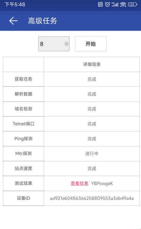 3、点击高级任务。填写任务id:8,点击开始,等待完成测试。