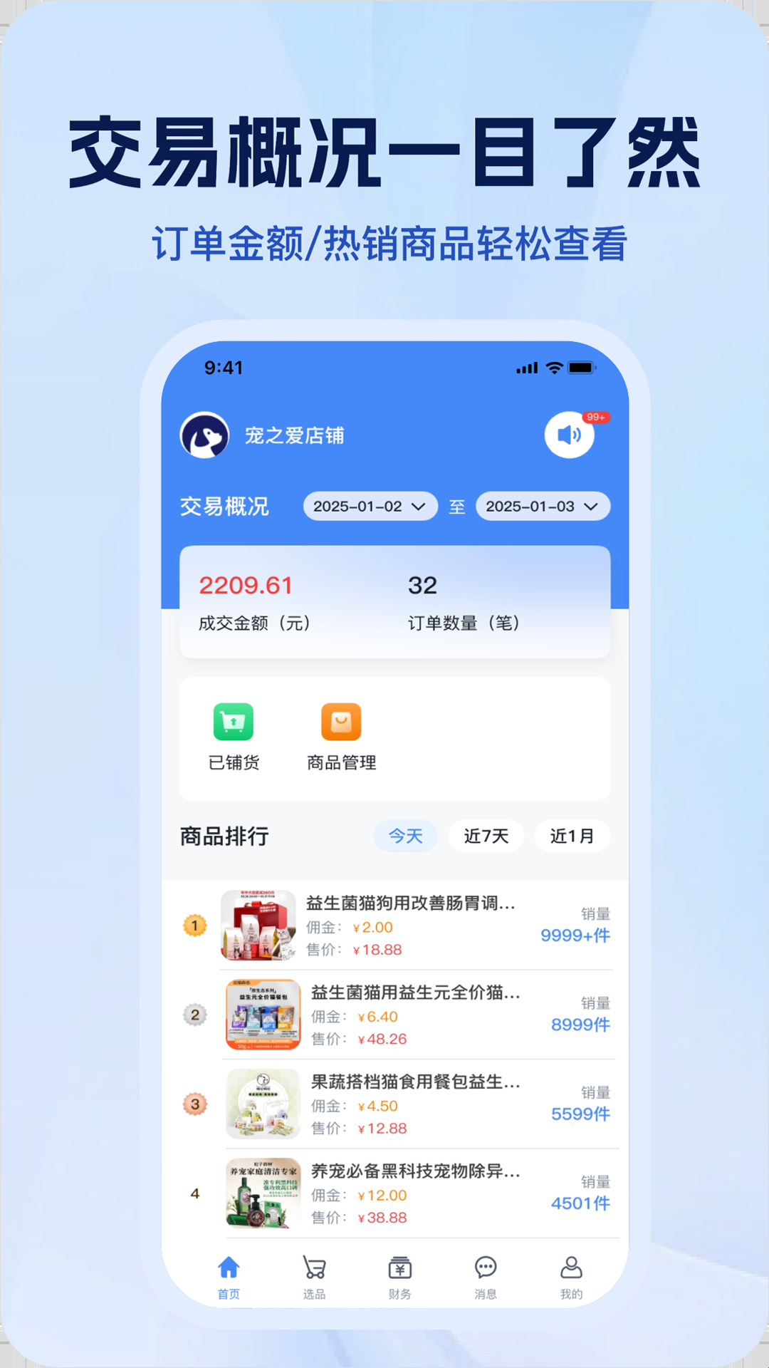 6、交易概况:将订单数量、成交金额进行了实时统计,用户可以随时查看了解店铺商品的交易概况详情。