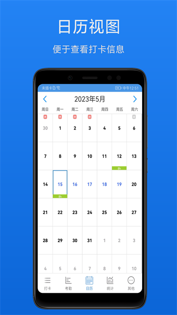 4、考勤日历,在日历中能够清楚的呈现出上班的状态;