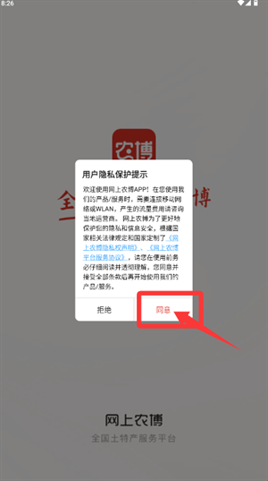 1、启动网上农博,在隐私声明窗口点选"同意",进入应用主页。