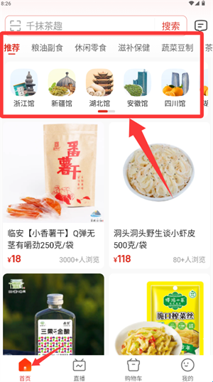 2、通过首页顶端搜索框或各地展馆推荐,快速定位心仪商品及特产。