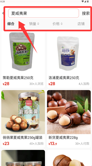 3、输入具体商品名称后,可按综合、销量或价格等维度筛选结果。