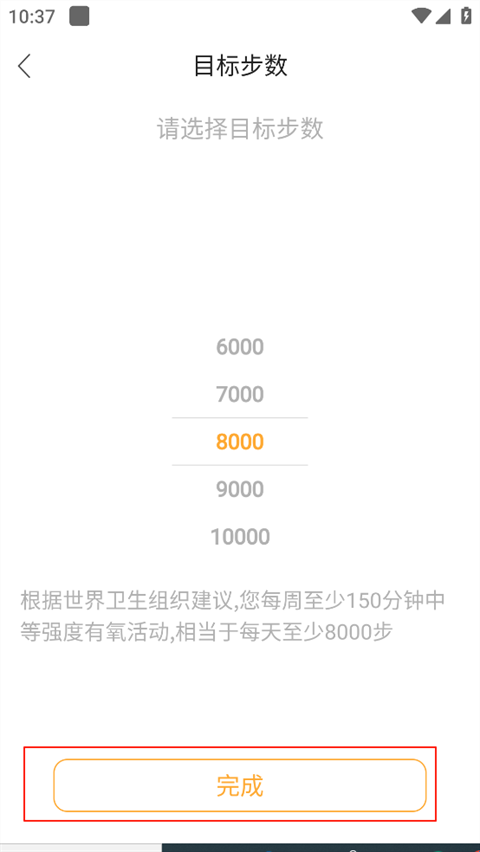 3、选择每天的目标步数,点击下方“完成”。
