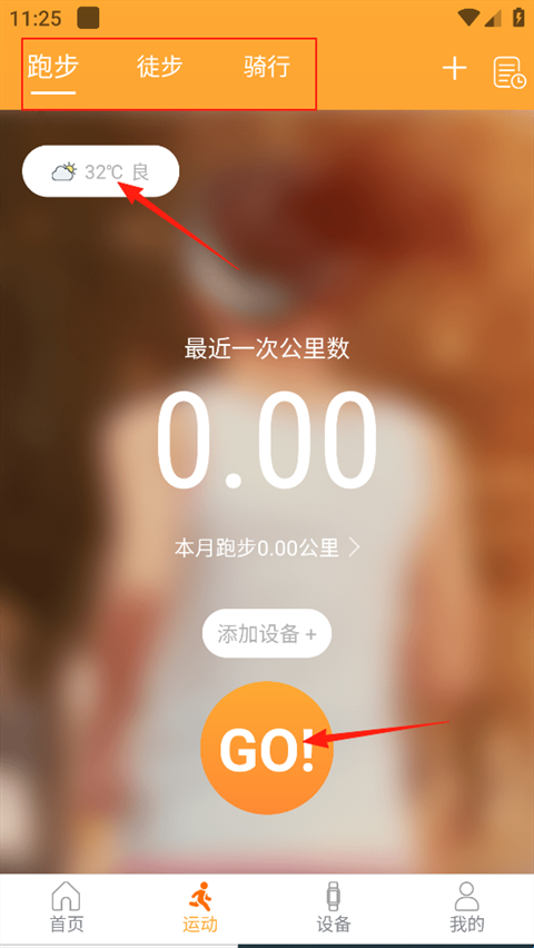 6、点击下方箭头处,即可开始运动监测,左上角箭头处可看到当天的天气情况,最上方红框处,可以选择运动方式。