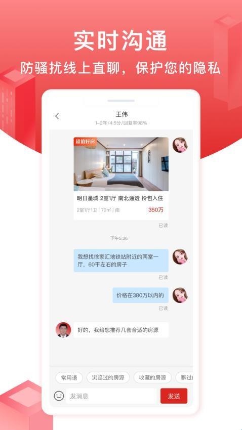 6、实时沟通:用户可以直接在软件上和经纪人或房东进行实时沟通,了解房源。