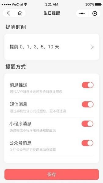 3、提醒设置:可设置提醒时间,支持短信、小程序消息、公众号消息提醒,让您不再错过重要日子。