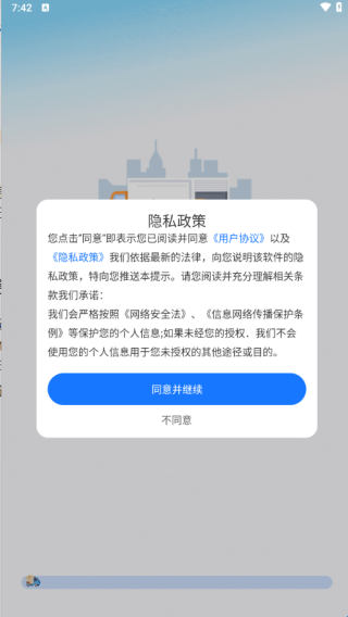 1、打开软件阅读隐私政策和用户协议,点击同意并继续即可开始使用。