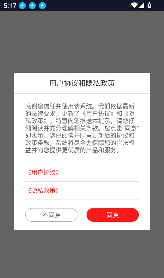 1、首先打开应用阅读完“用户协议和隐私政策”后来点击“同意“按钮进入app中。
