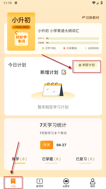 3、点击下方的“计划”,可以自定义每天的学习计划。