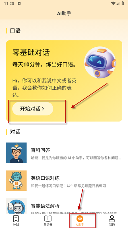 4、点击下方的“AI助手”,可以开始对话,趣味学习英语。