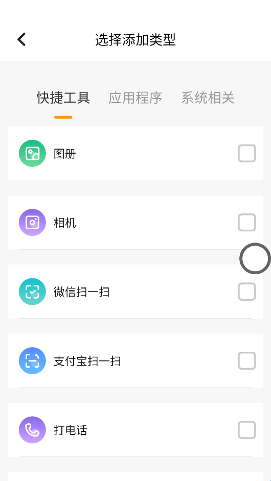 4、选择要添加的快捷工具、应用程序或系统相关,点击即可添加。