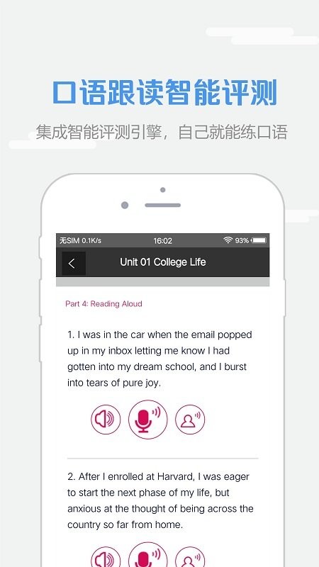 (4)内置英语跟读自动评分引擎,实现口语跟读自主训练。