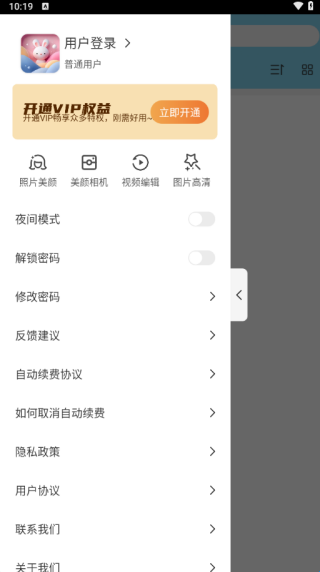 4、来到软件设置页面可使用夜间模式、解锁密码、修改密码、反馈建议等功能。