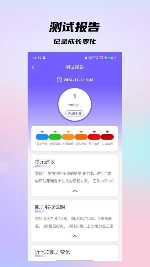 盆底动力是一款致力于提升生活品质的健身锻炼软件,具有方案定制、锻炼帮助、锻炼等级、锻炼数据、测试报告等多个方面的锻炼内容,还可以支持用户任意切换合适的锻炼模式,为广大人群锻炼盆底肌提供了全方位的锻炼服务,帮助用户提高训练效率。