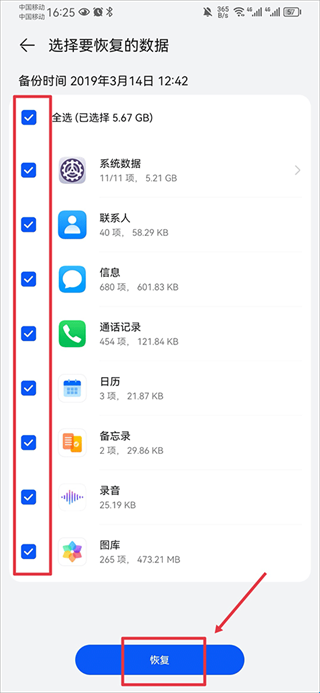 4、最后选择需要备份的数据并点击恢复即可。