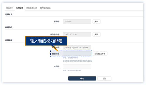 3、点击密保邮箱“更改”,输入新的校内邮箱,点击“获取验证邮件”,输入验证码之后点击“确定”,修改邮箱成功。