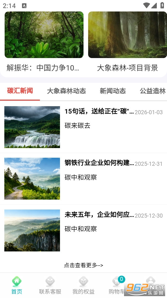 大象森林app是一款专注于林木产品交易、林业种植项目,提供多种优质树木相关商品的选购软件。支持把心仪商品加入购物车统一结算,支付流程顺畅高效。定期更新平台动态、植树造林相关资讯,浏览这些内容有助于帮助使用者掌握环保领域最新进展。能直接参与平台组织的林业种植计划,以实际行动支持生态保护工作。
